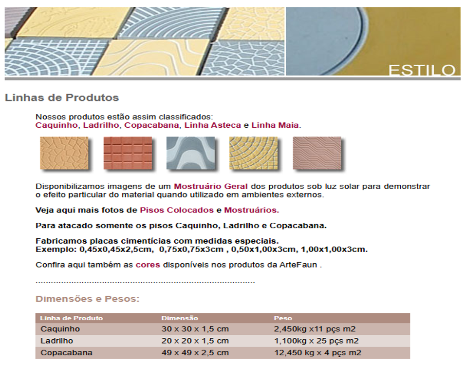 Os pisos ArteFatun com altura de 1,5cm a 6,0cm são compostos de cimento e agregados minerais, o que garante a durabilidade e resistência necessária para tráfego de pedestres e veículos de pequeno porte, sempre observando se o solo foi bem compactado e o concreto magro (aguada), foi bem feito. Para mais informações entrar em contato com nosso atendimento.